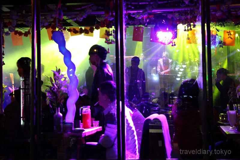 麗江古城は瓦葺の屋根が特徴的な建物が並んでいる街で、昼間に散策しても十分に雰囲気のある街並みですが、一転して夜になると店内外がライトアップされて、ライブバンドの演奏と共にどんちゃん騒ぎをしているような店も多かったです。