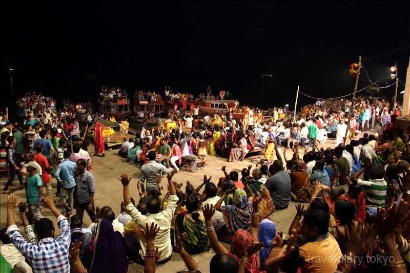 数十ルピーを支払えば、ガンジス川に向かって行われてるプージャの儀式の正面で、停泊したボートに乗って見学することもできます。