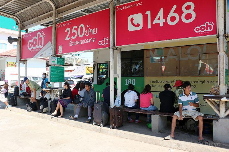 初めはどこにタイ方面行きのバス停があるのかがよく分かりませんでしたが、よく見たら案内板があって小さな文字で「Lao – Thai International Bus Stop」と書かれていました。
