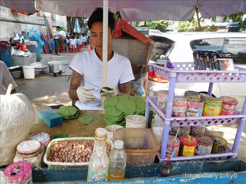 ↓ 噛みタバコ屋さん。キンマの葉に石灰を塗って、ビンロウジを包んだ物を売ってます。